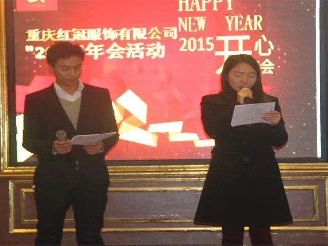 2016年1月30日,紅冠服飾2015年度年終總結表章大會在999大酒店順利召開,會議由公司銷售部文藝青年楊義華和秦際誠主持,公司全體員工近百人參加會議。